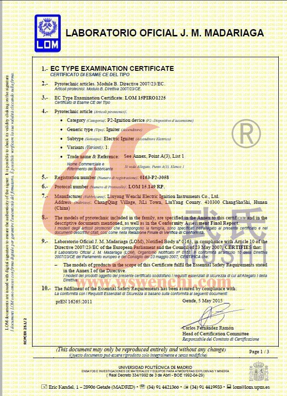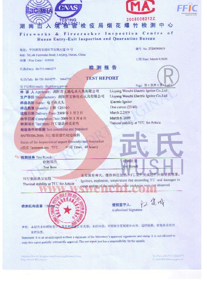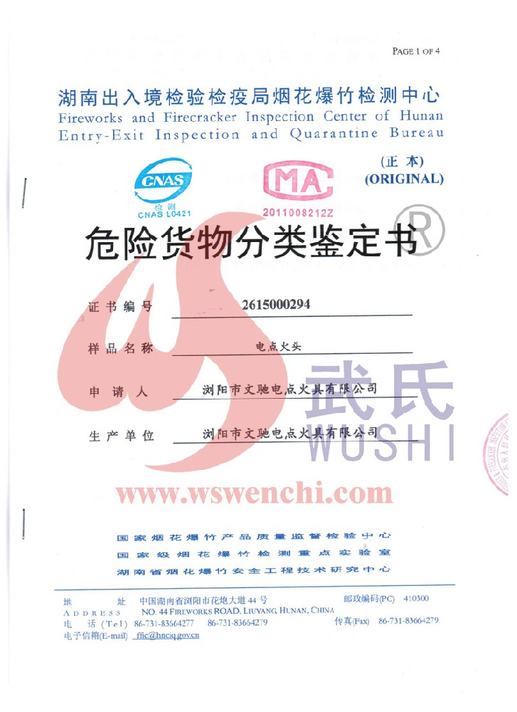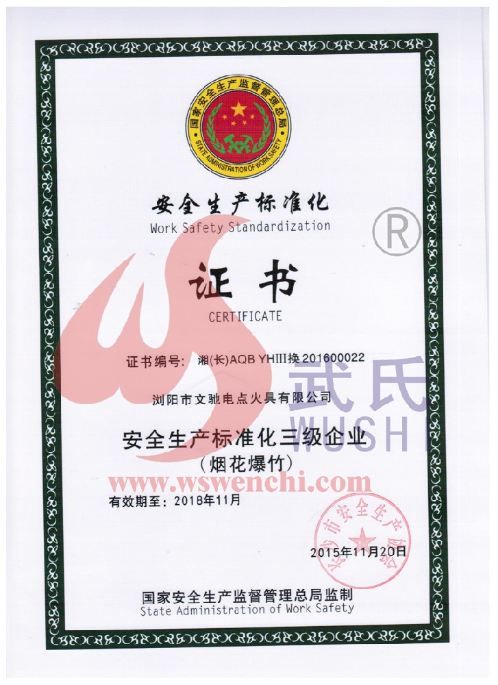 瀏陽市文馳電點火具有限公司(原培文電子點火器材廠),創(chuàng)建于1998年,是一家專業(yè)從事研制銷售電子點火產品的民營科技企業(yè),是我國第1枚煙花用電點火頭生產者,是《煙花爆竹電點火頭國標》牽頭起草單位。公司位于中國“煙花之鄉(xiāng)”湖南省瀏陽市,地理位置優(yōu)越,交通便利。 我公司研制的對象是用電能引燃火藥、做機械功等預定功能的一次性使用的元件或裝置,包括電點火頭(英文名ElectricMatch or Electric Igniter,中文俗稱“電火柴”或“電發(fā)火頭”)、電點火管和延期電點火管;我們估且在以后的產品技術欄中將我們研究的產品統(tǒng)稱為電點火具,將電點火器看成是用于提供和控制供給電點火元件點火的電能器材;我們研究的電點火橋路有橋絲式、無橋絲···